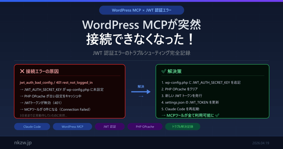 Claude CodeでWordPressブログをMCPサーバー経由で管理していたところ、ある日突然MCPツールが一切使えなくなりました。3日前まで正常に動作していたのに、再起動しても一向に接続できない状態が続きました。この記事では、原因究明から解決までの全過程を記録しています。